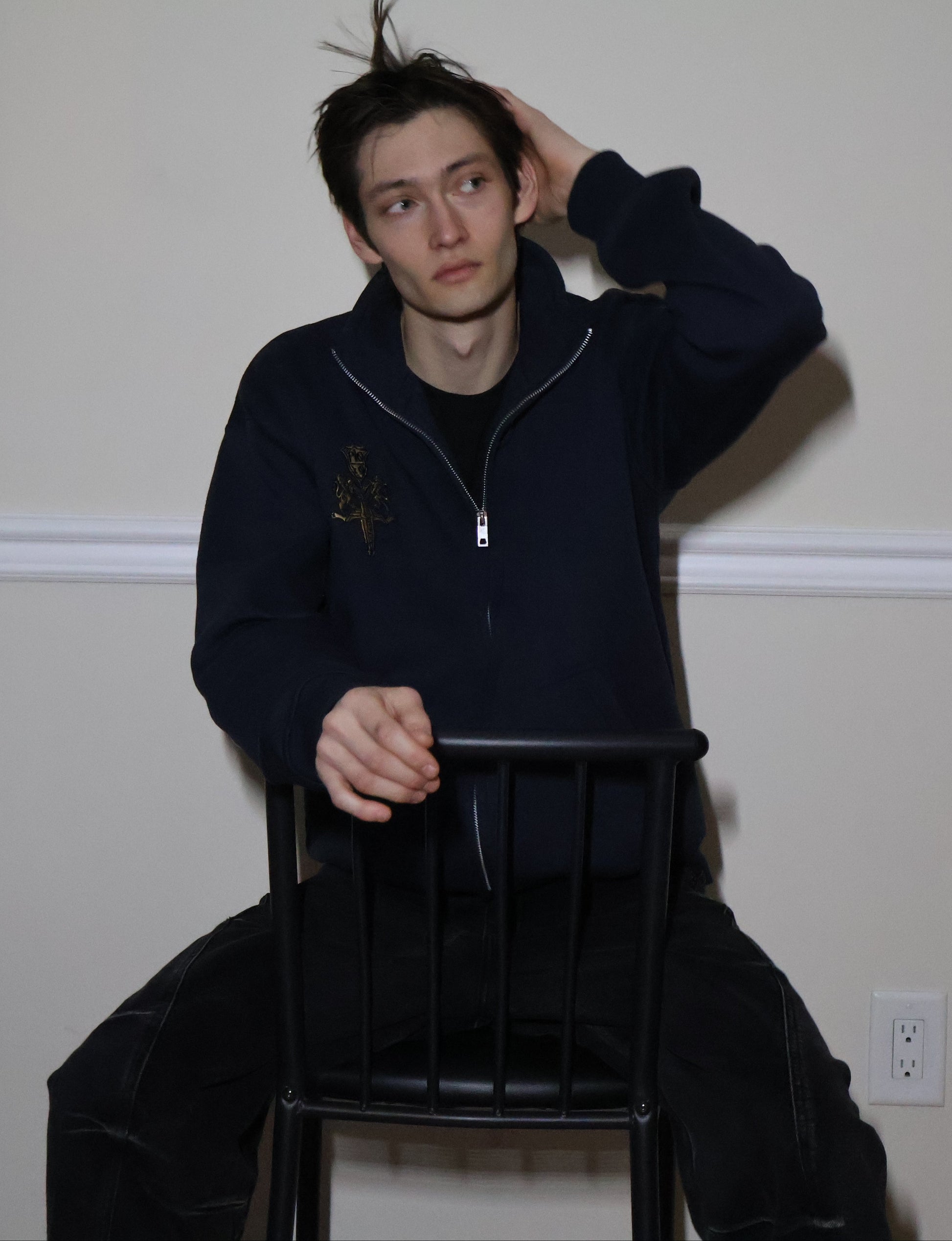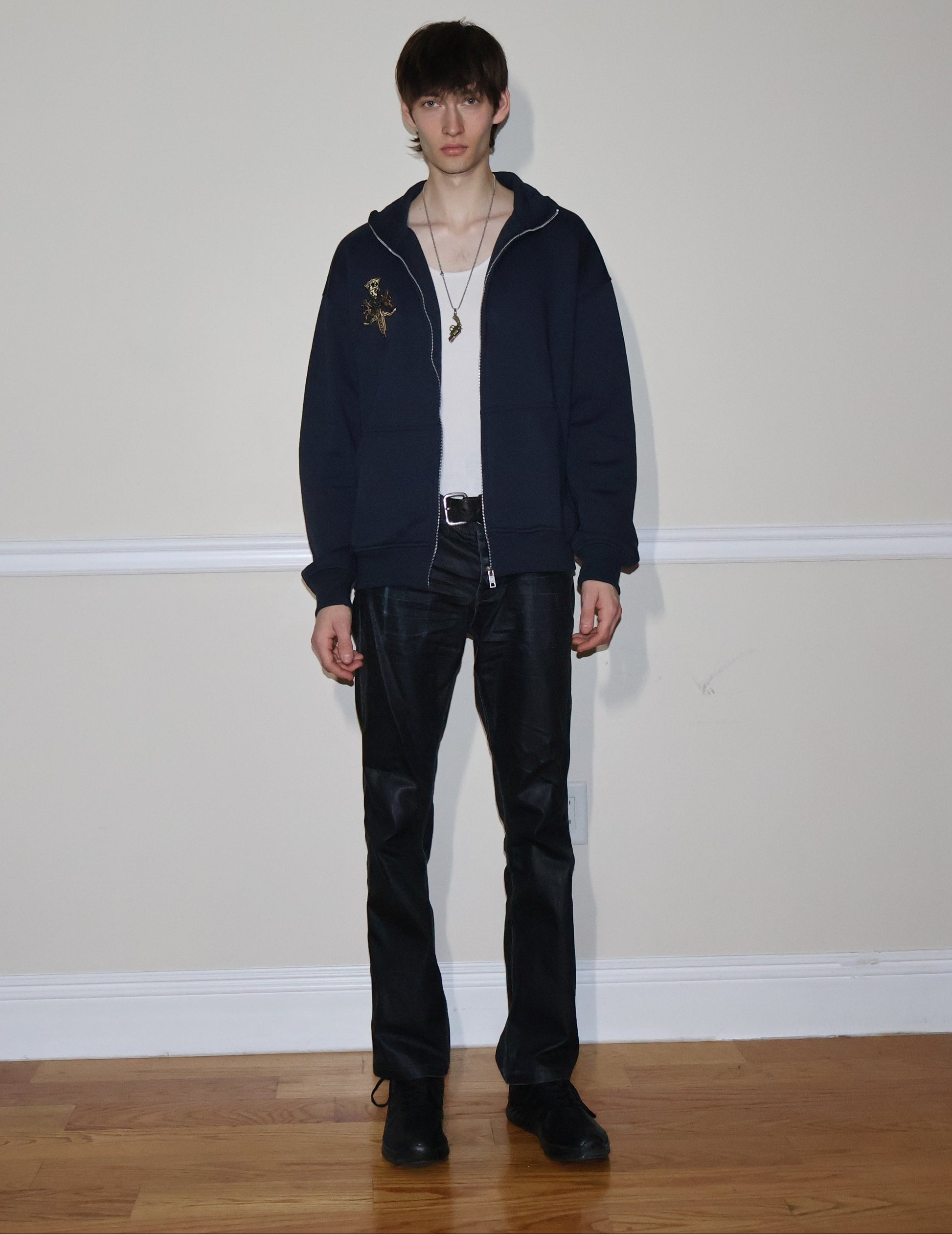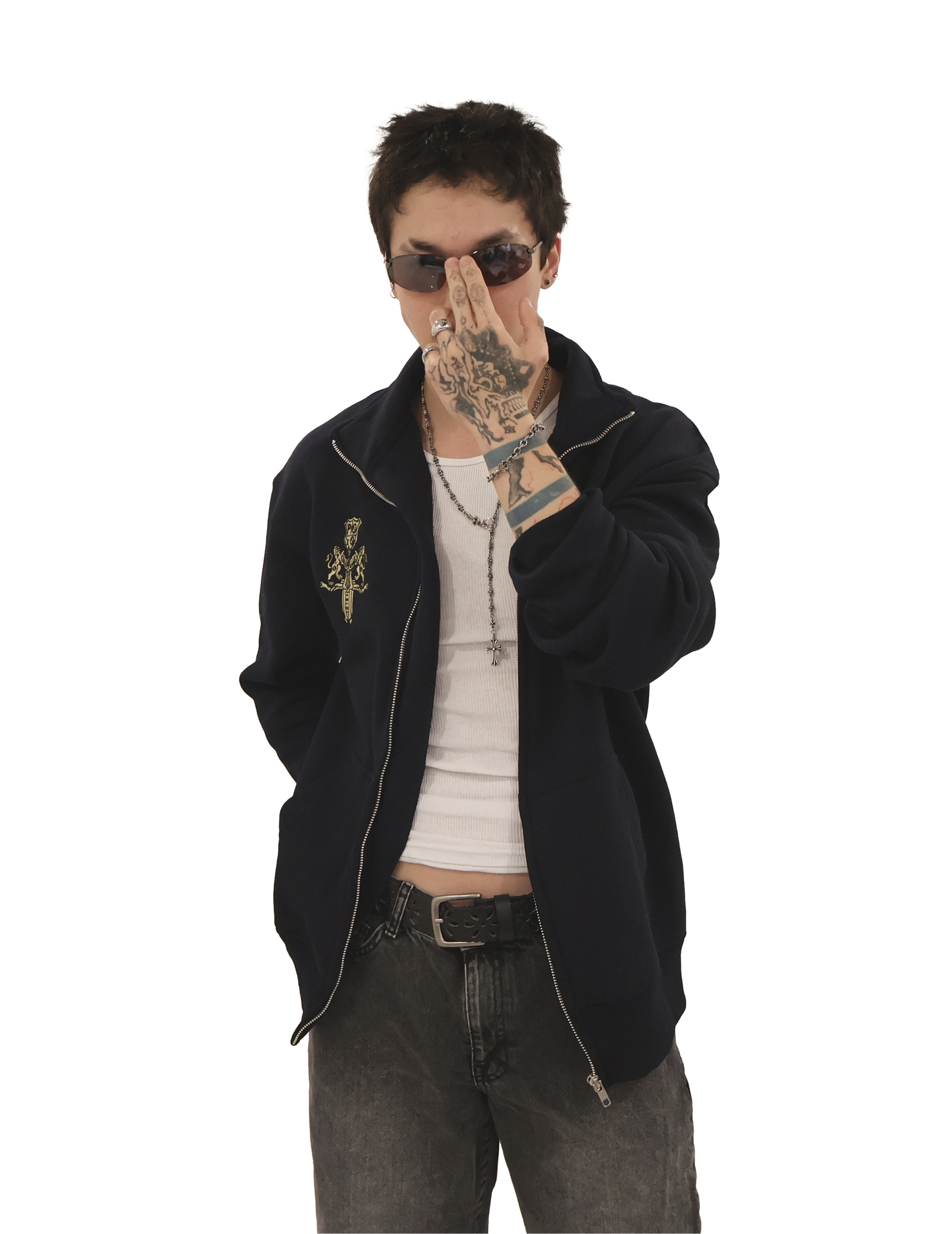 OUT OF STOCK ITEM ; PRE-ORDER is for the next RESTOCK!!! [15% OFF HOLIDAY SPECIAL] crisp matte navy blue fleece jacket. 100% cotton, stitched embroidery, and a collar keep you looking cool.