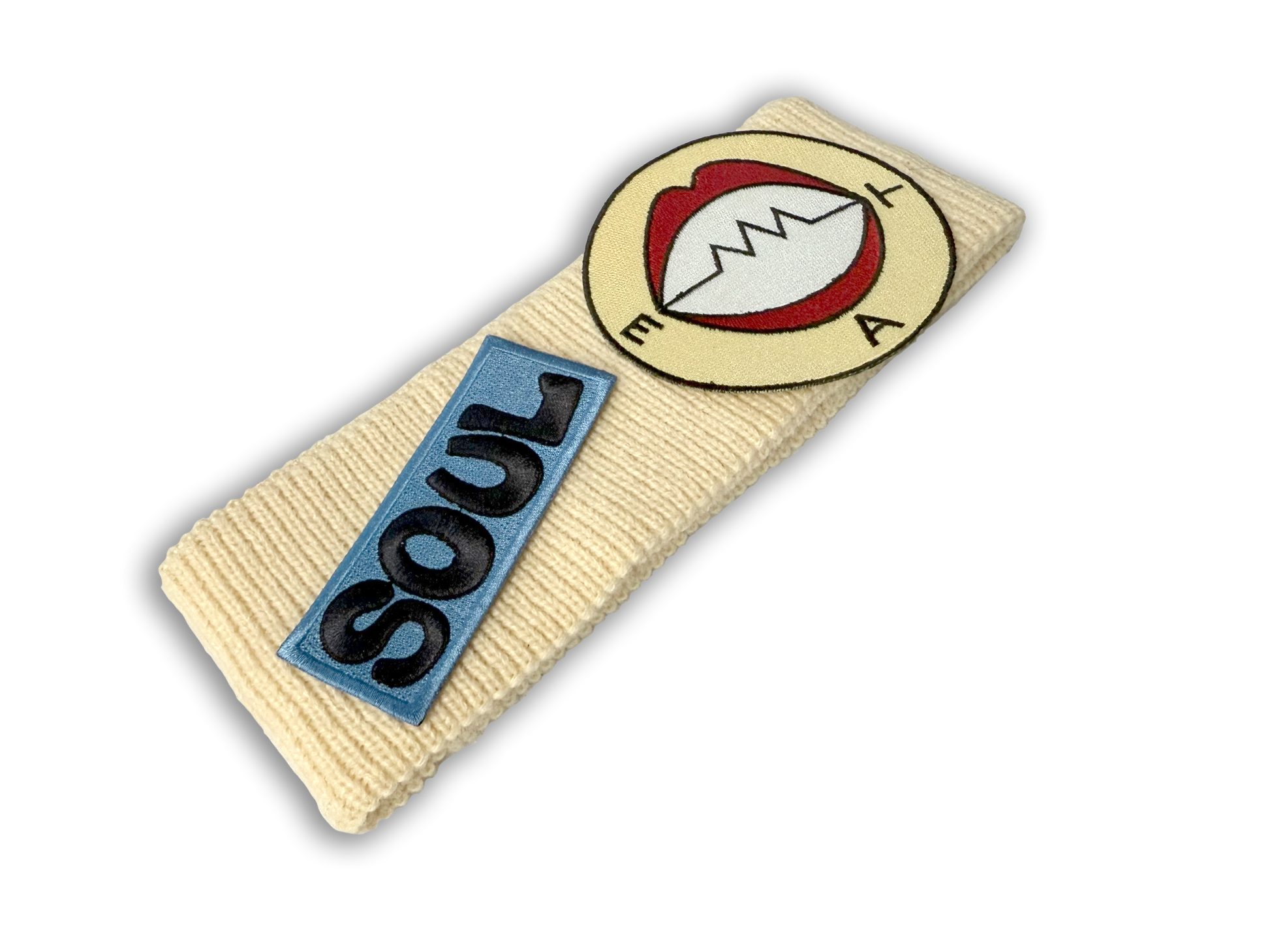 beige knit headband with patchwork embroidery, made of 100% cotton ...